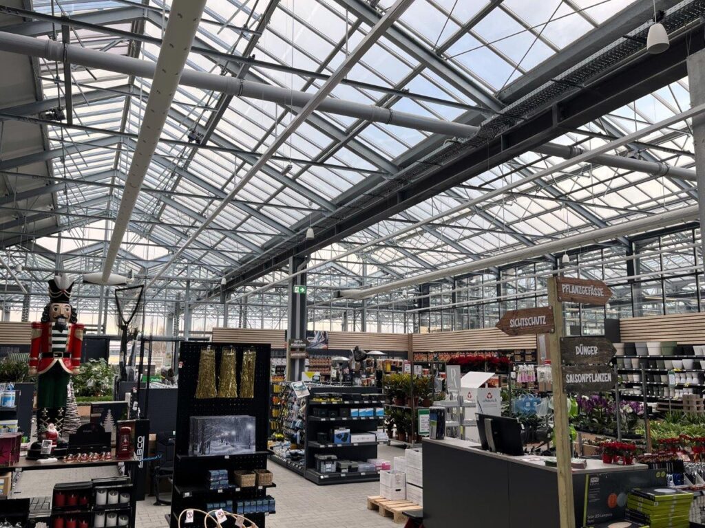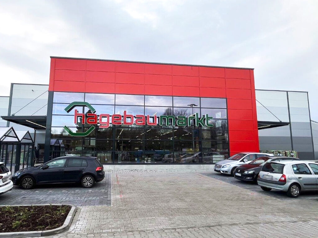 Nach dem vollständigen Brandschaden wurde der hagebaumarkt in Varel neu errichtet und in moderner Breitschiffbauweise umgesetzt. Das Gebäude besteht aus einem hochgedämmten Warm- und Kalthaus, realisiert mit thermisch getrennten Systemen, die eine hohe Energieeffizienz und dauerhafte Nutzung gewährleisten.